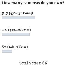 The camera poll has officially ended, and the results are in. Looks like many of us have at least a few cameras in our bags…fun stuff. Where did you fit into the picture? Thanks to the 66 that did join in for these last two months!