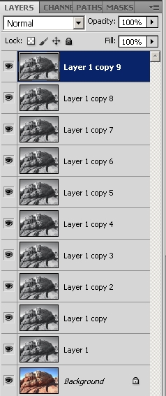 To start, I took an image and pulled it into Photoshop. Realizing that I would need to do some virtually identical steps across several images, on the first one, I started the process of creating an action. The action in essence, creates a duplicate layer of the image, converts it to black and white, then repeats the duplication for another 9 black and white layer copies. So, ultimately your Layer panel has 11 layers to it – 10 black and white layers and one color layer (at the bottom).